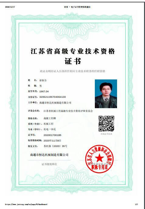 經(jīng)過(guò)書面材料審核,常州現(xiàn)場(chǎng)面試,南通恒達(dá)公司董事長(zhǎng)崔恒全同志通過(guò)層層考核,獲評(píng)高級(jí)工程師并頒發(fā)證書。